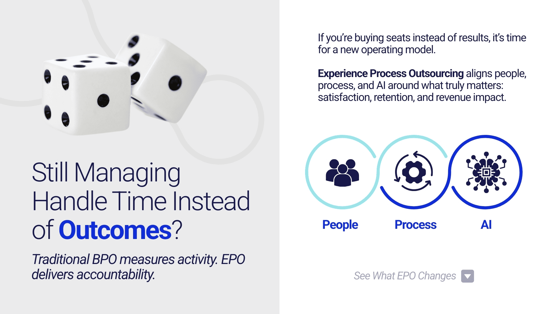 EPO is: outcome ownership, experience by design, human + AI, continuous improvement, true partnership. EPO is not: labor arbitrage, ticket processing, static SLAs, replacing people with AI, vendor-only relationships. When we talk about customer experience business process outsourcing, we mean the kind of partnership that marries strategy and action to create durable results.