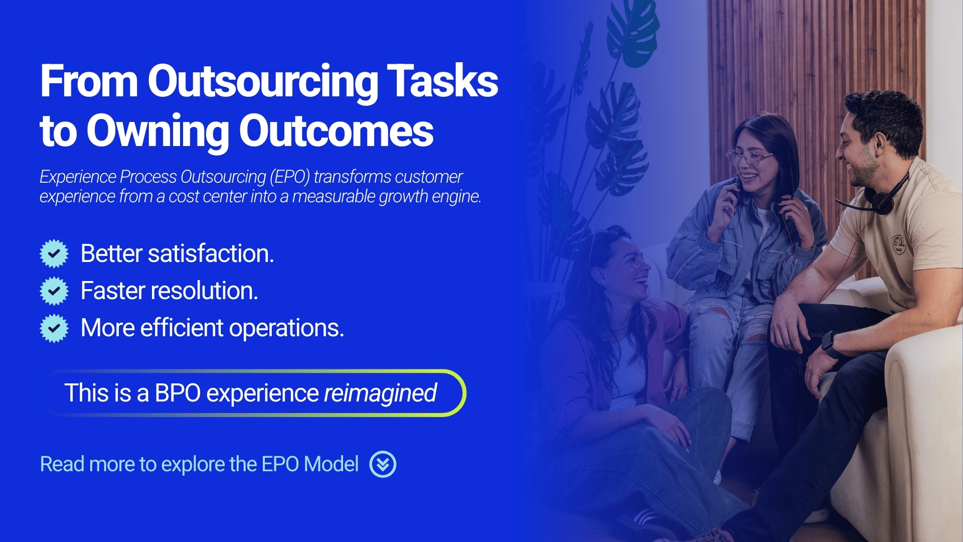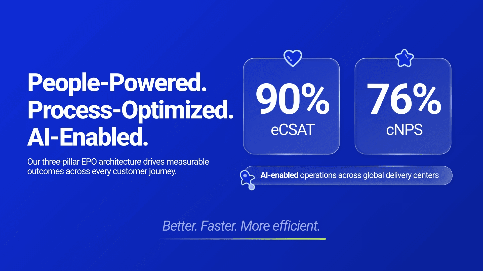 How we deliver on our true north: Better, Faster and More Efficient. Better, as higher-quality experiences. Faster, as in smoother, quicker journeys. More efficient, as less friction, more value. Great experiences are not just what we deliver; they are how we operate. This is customer experience business process outsourcing with purpose.